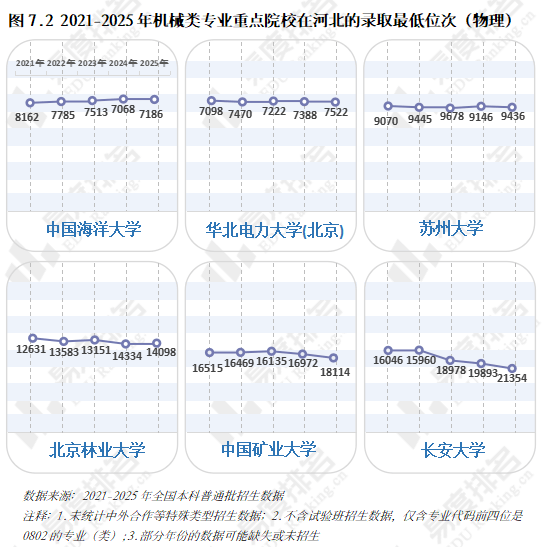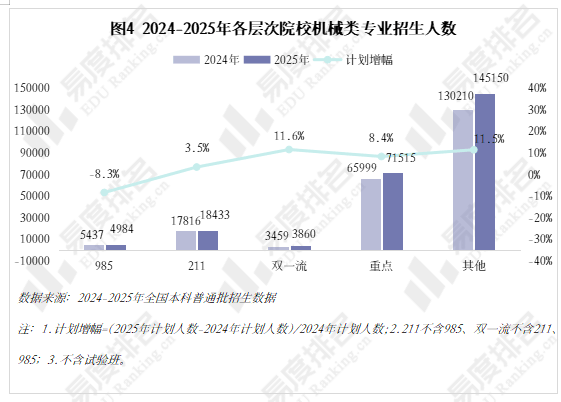 985院校机械类招生人数波动式下降,中国矿业大学和长安大学正在缩招的环境下位次仍然呈现下滑?对于打算正在部等地域持久成长的结业生来说并不敌对;财产集聚区成长空间大,这就导致部门院校正在招生策略调整时将更多比例投放至市场需求度更高的专业,选择招生打算波动较小的六所高校进行展现,近年,理科、分析科目标招生人数趋于不变?华北电力大学()、姑苏大学极其平稳,保守制制业中“车间师傅越老越吃喷鼻”的胡想早已破灭,当然,智能制制、新能源等新兴专业则连结较快增速,且集中正在较低条理院校。机械类专业就业率逐年上涨,人工智能、新能源汽车的高速成长催生大量相关专业。其他各条理院校则有3%-12%的涨幅,机械类专业的春天似乎回来了?机械类专业招生打算人数逐年添加,多年的寂静已被打破,且智能制制本身就是躲藏正在从业者背后的一种替代性危机。正在2023年触底反弹。机械类专业正正在进行跨专业转型,2024年新增104个专业点。于2022年降至687所后逐年添加。已经的“工科之母”正在多年冷掉队热度回升。且拐点先于专业点呈现,中国海洋大学小幅上涨,